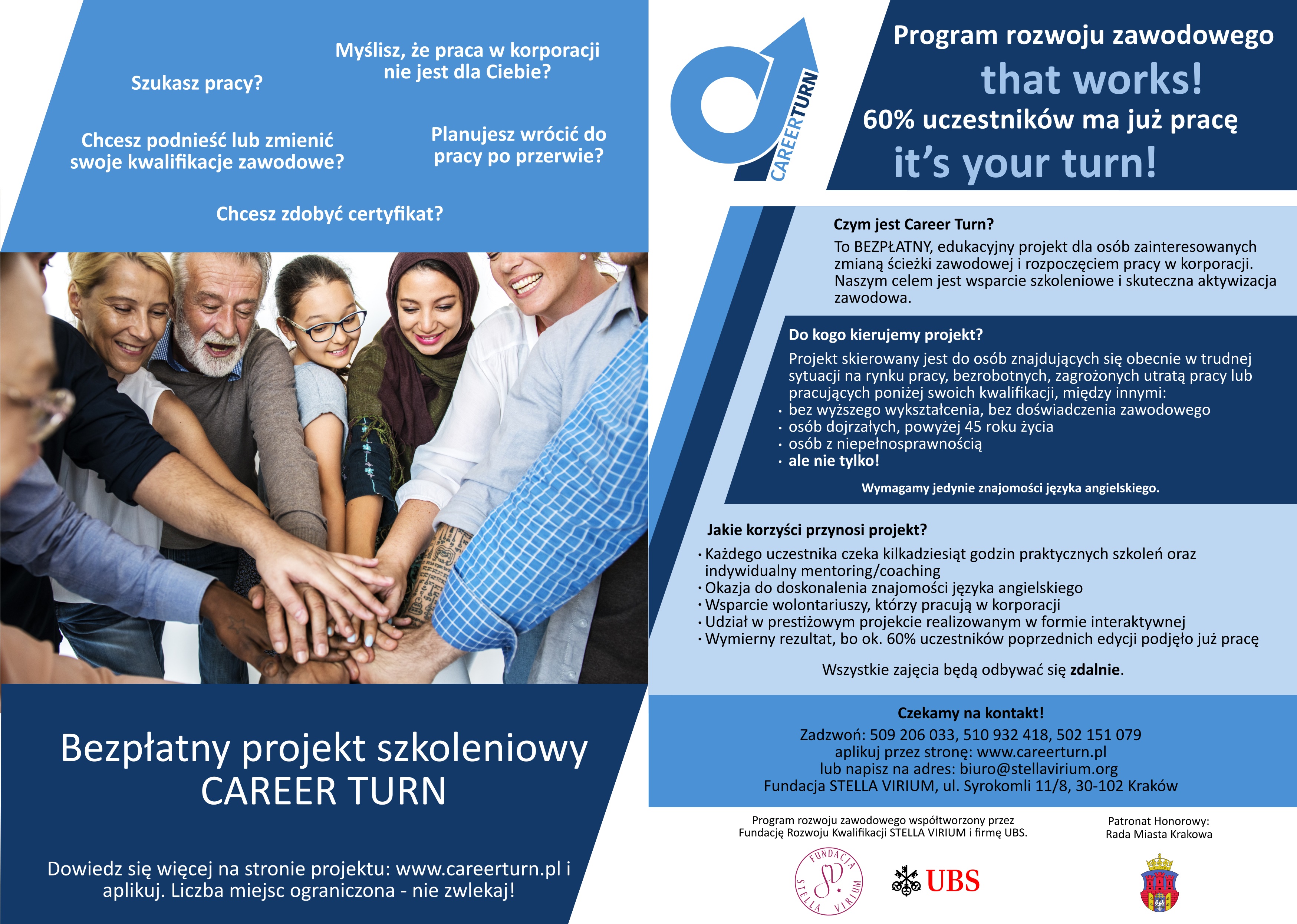 Projekt Career Turn - bezpłatnego wsparcia skierowany do osób wchodzących na rynek pracy lub mających trudności z podjęciem zatrudnienia.